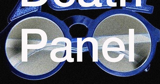 [Image Description: Blue round sunglasses with silver lenses and decorative numbers reading “2021” sit on a black background. The image is noisy, grainy, and textured. Superimposed on top are the words “Death Panel” in white lettering.]